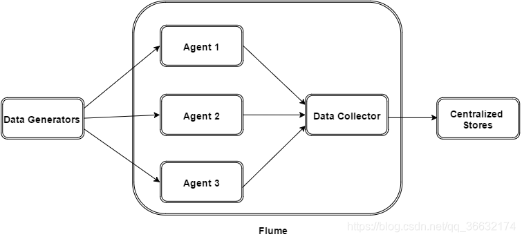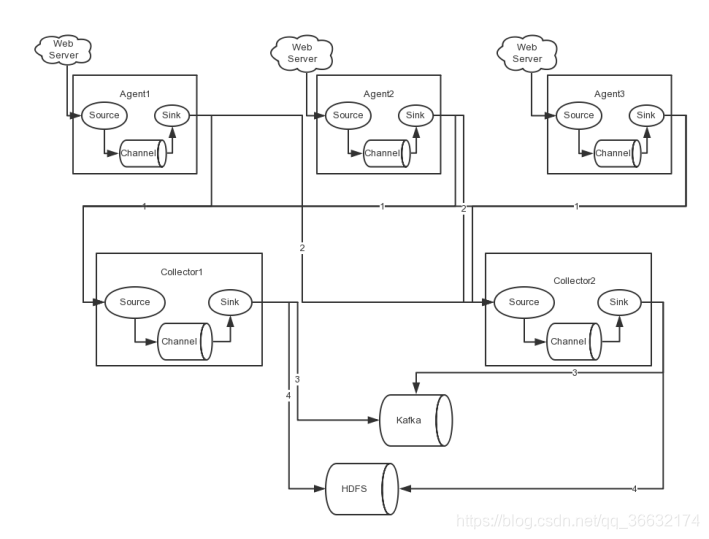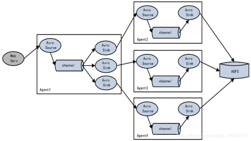 ①多个Agent顺序连接:将多个Agent顺序连接起来,将最初的数据源经过收集,存储到最终的存储系统中。一般情况下,应该控制这种顺序连接的Agent的数量,因为数据流经的路径变长了,如果不考虑Failover的话,出现故障将影响整个Flow上的Agent收集服务。