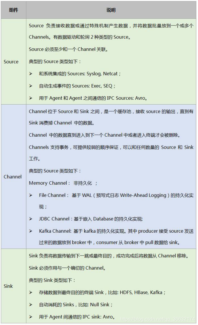①source:source组件是专门用来收集数据的,从数据发生器接收数据,并将接收的数据以Flume的event格式传递给一个或者多个通道channal,Flume提供多种数据接收的方式,比如avro、thrift、exec、jms、spooling directory、netcat、sequence generator、syslog、http、legacy、自定义。