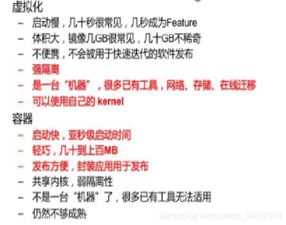 3、虚拟化手段的变化-cloud时代采用标配硬件来降低成本,采用虚拟化手段来满足用户按需使用的需求以 及保证可用性和隔离性。然而无论是KVM还是Xen在 docker 看来,都在浪费资源,因为用户需要的是高效运行环境而非OS, GuestOS既浪费资源又难于管理, 更加轻量级的LXC更加灵活和快速。