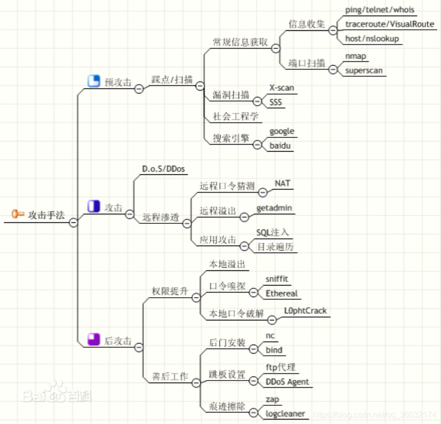 通常的黑客攻击包括预攻击、攻击和后攻击三个阶段:
