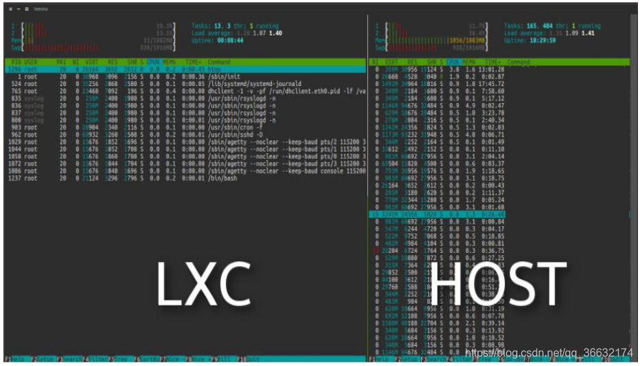 因此,一个LXC虚拟操作系统具有最小的资源需求,并启动只需几秒钟。正如可以在下图中看到的,左侧是LXC虚拟的Ubuntu ,默认安装使用 11 MB 大小。