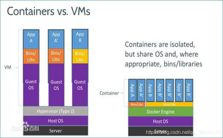容器与虚拟机有着类似的资源隔离和分配的优点,但不同的架构方法使容器能够更加便携,高效等虚拟机是将一台服务器变成多台服务器的物理硬件的抽象。每个虚拟机都包括应用程序、必要的二进制文件和库以及一个完整的客户操作系统(Guest OS),尽管它们被分离,它们共享并利用主机的硬件资源,将近需要十几个GB的大小。
