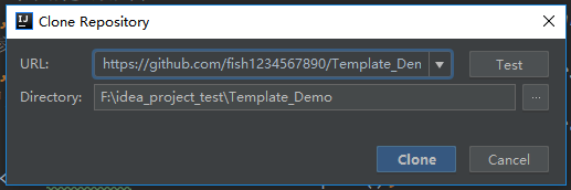 Directory填写你要把这个项目从远端拉下来之后存放的路径,比如这里的F:\idea_project_test\Template_Demo,项目拉下来之后会存放在这个目录下面,如果这个目录不存在,idea会自动帮你创建。