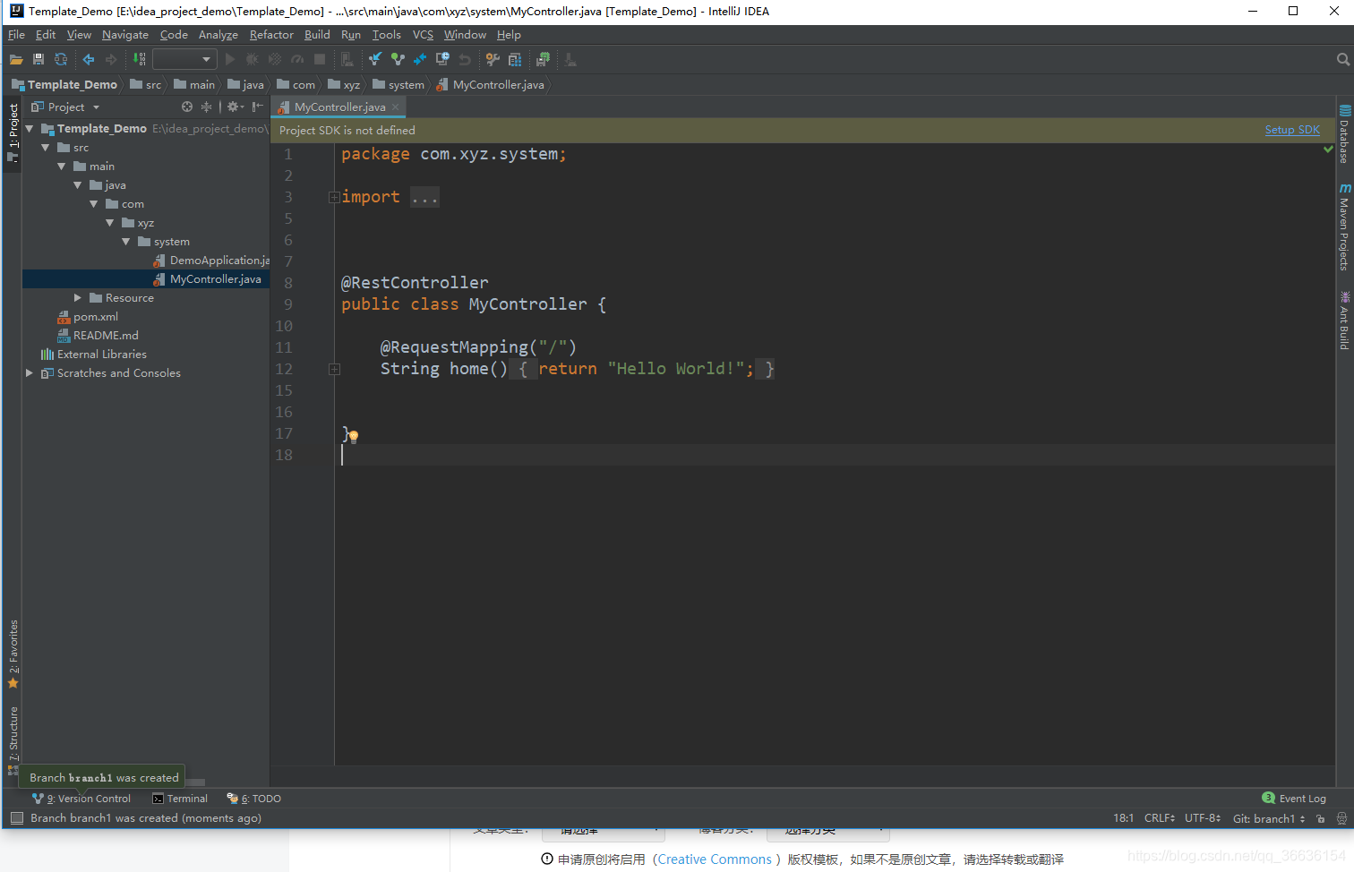 我们这边创建一个名字叫branch1的分支并且勾选checkout branch,创建完之后自动切换到我们创建的这个分支,界面如下: