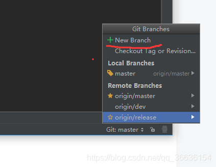 图中标号为2的框中展示的是远程分支,我这个项目在远端有三个分支master,dev,release,origin指的是仓库名(仓库名没有特别指定默认就叫origin)。