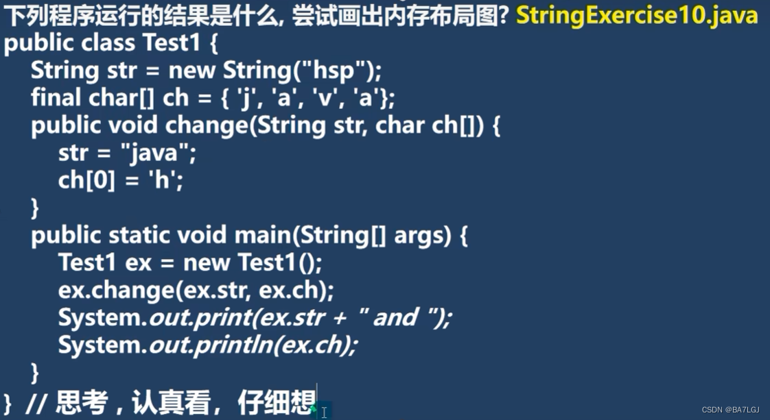 java变hava的原因是,java传数组是 引用值 传递,也就是ex.ch[]的地址(0x44),给了change方法的形参ch(0x44),又因为ch[0]操作的是 ch指向地址(0x44)(这个地址来源于ex.ch[](0x44))字符数组下表为0的字符,所以会修改到堆区 0x44地址的下标为0字符。至此,j变为h。并且最后的ex.ch引用的也是堆区中0x44的地址,所以输出的是hava