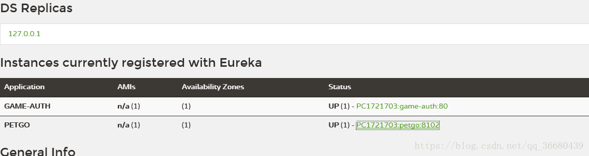 然后我猜想可能消息转发过来的时候 所带的ip地址就已经不对了,于是我打开了eureka的管理页面,果然服务所对应的status一栏写着 172_17_0_3:8012 ,接着我在本地启动项目对比发现本地显示的是计算机本身的名字。