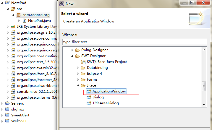 2)、在src的目录下创建Packge 包 ,然后右击改包 new->other->WindowBuilder->SWT Designer->JFace->ApplicationWidow 命名随你!
