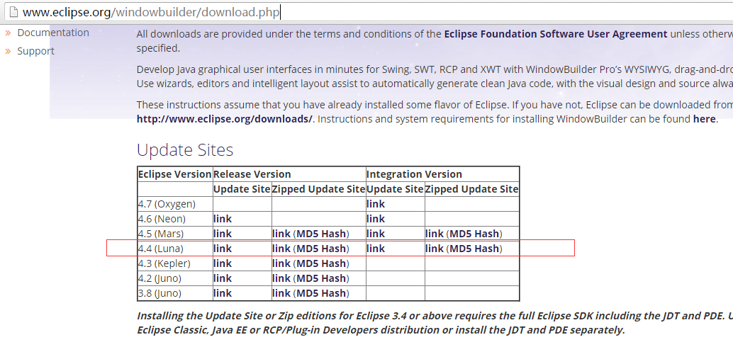 2)、我当前实例的版本是4.4.2 所以我获得的SWT地址是:http://download.eclipse.org/windowbuilder/WB/release/R201506241200-1/4.4/