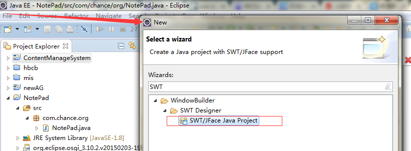 1)、 打开Eclipse,new->other->WindowBuilder->SWT Designer->SWT/JFace Java Project 命名就随你咯