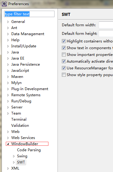 在exlipse 选线栏中赵丹Windows --> Prefences -->WindorBudier 查看是否有SWT插件!