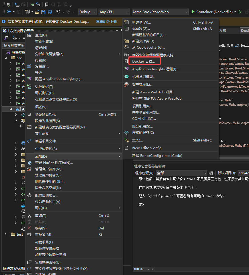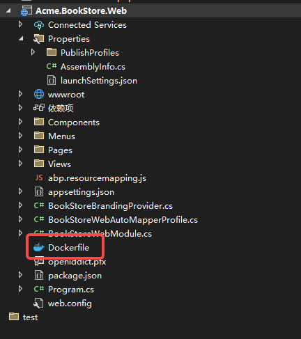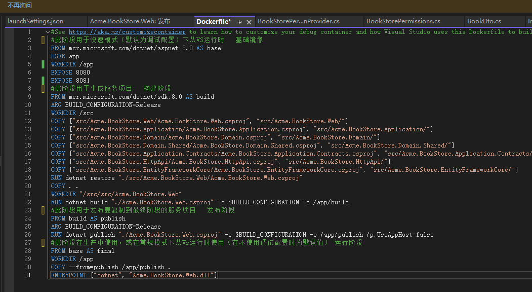 注意:ENTRYPOINT ["dotnet","Acme.BookStore.Web.dll"]Acme.BookStore.Web.dll是我项目的dll。项目不一样名字就不一样。这里请用实际项目的dll名称哦