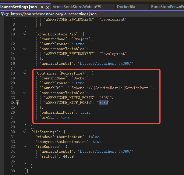 打开项目 目录 Properties 下 launchSettings.json 文件,将会看到新增的如下内容: