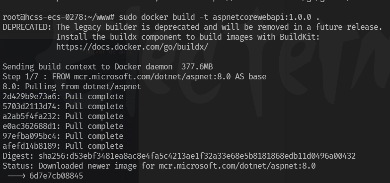 sudo docker build -t aspnetcorewebapi:1.0.0 .