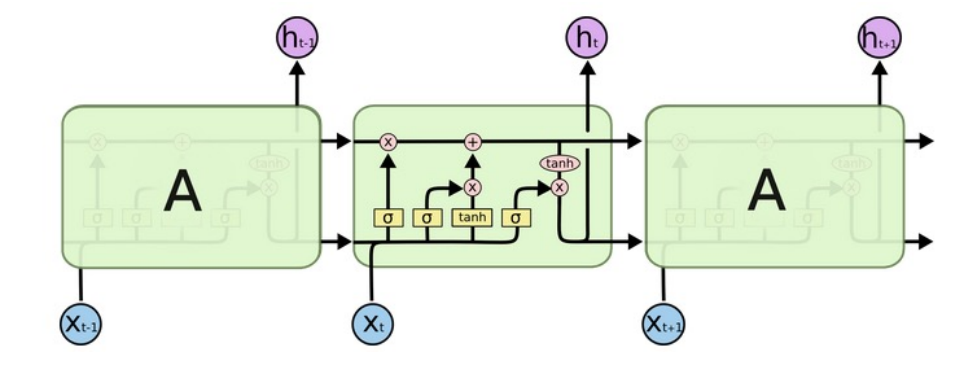 5.每个时间步有三个输入:数据端输入,上一个时间步细胞状态,上一个时间步的