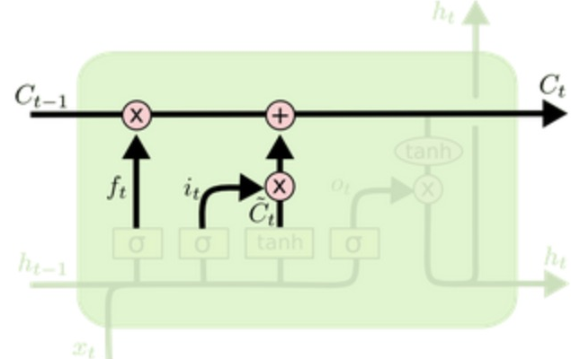 - 遗忘门作用在上一个时间步细胞状态之上+输入门作用内部细胞状态之上,更新细胞状态。