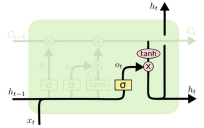 - 输出门作用内部细胞状态之上,表示对内部细胞状态要使用多少。