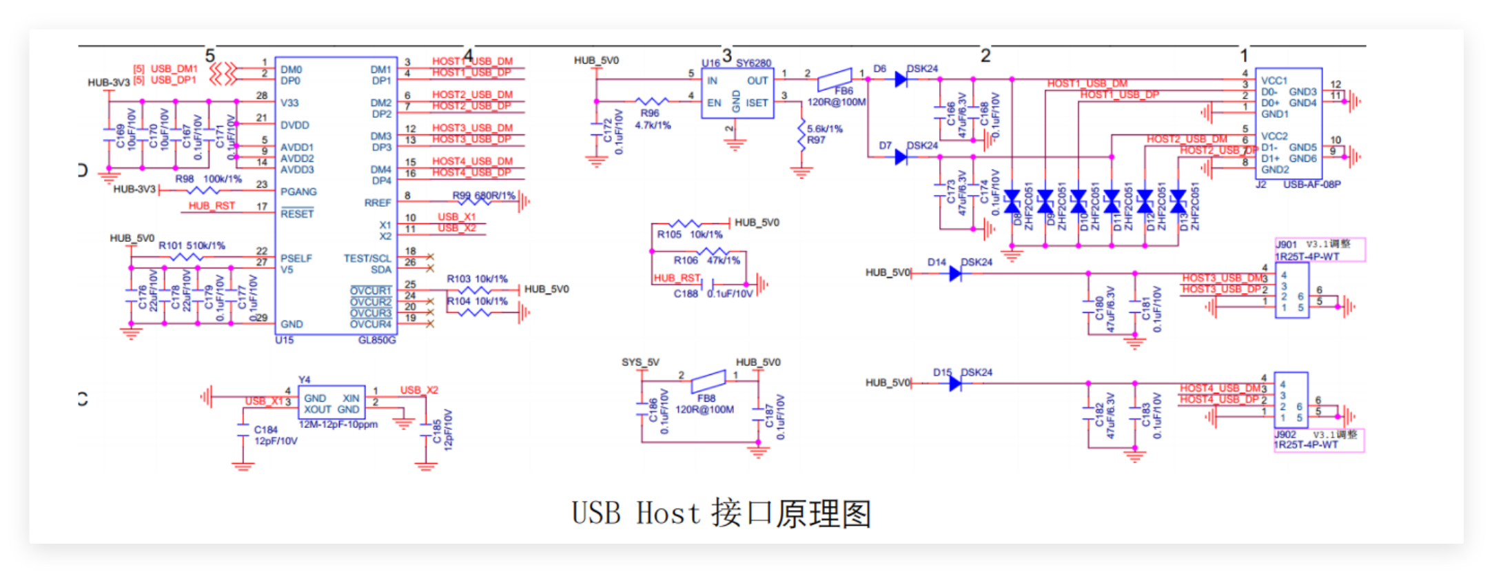 STM32MP1 系列处理器内部集成 2 路高速 USB2.0 控制器,分别为 1 路 USB Host 和 1 路 USB OTG,FS-MP1A 开发板将 USB OTG 通过 mini USB 座直接引出,可用于 Device 使用。另 外 1 路 USB Host 通过 USB HUB 芯片(GL850G)扩展出 4 路 USB HOST 端口,2 路采用 USB TypeA 双层连接器引出。2 路采用间距 1.25mm-4P 接插件预留,可用于与外部 USB 设备通讯, 电路设计如下所示: