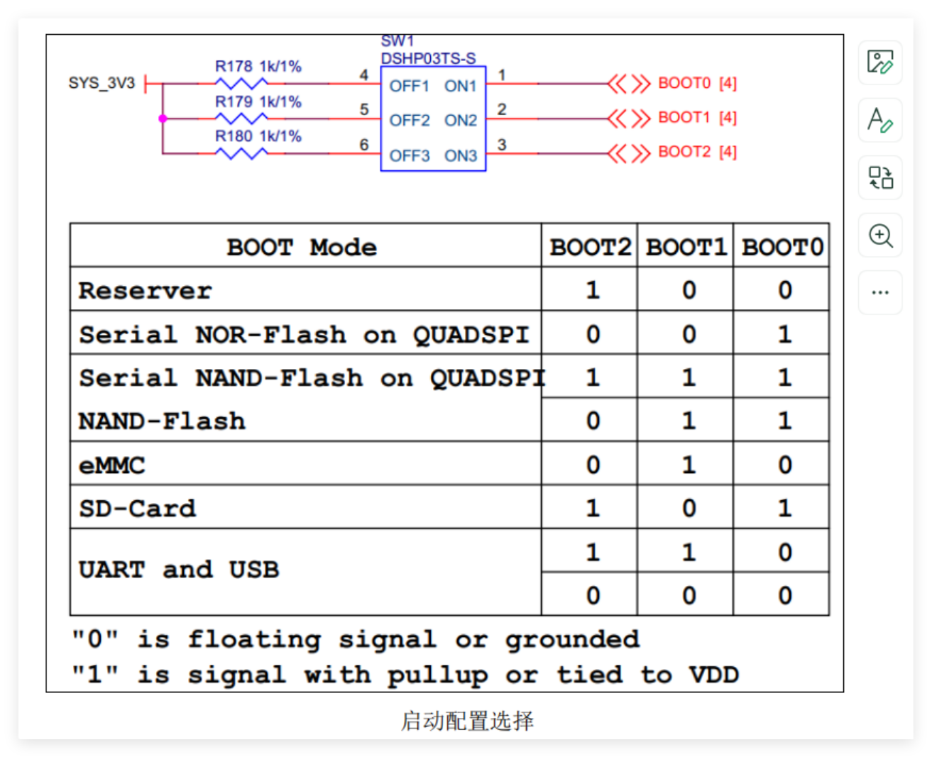 STM32MP1 系列 MPU 内部固化 Boot ROM 程序,支持配置处理器从不同的外设或者接口启 动,处理器启动时会首先执行 Boot ROM 程序,该程序会检测 BOOT[2:0]引脚电平,根据引 脚电平配置为不同启动方式。BOOT[2:0]引脚内置下拉电阻,FS-MP1A 开发板将 BOOT[2:0]管 脚串联一个 3 位拨码开关后,通过 1k 电阻连接到 3.3V 电源。电路设计如下所示: