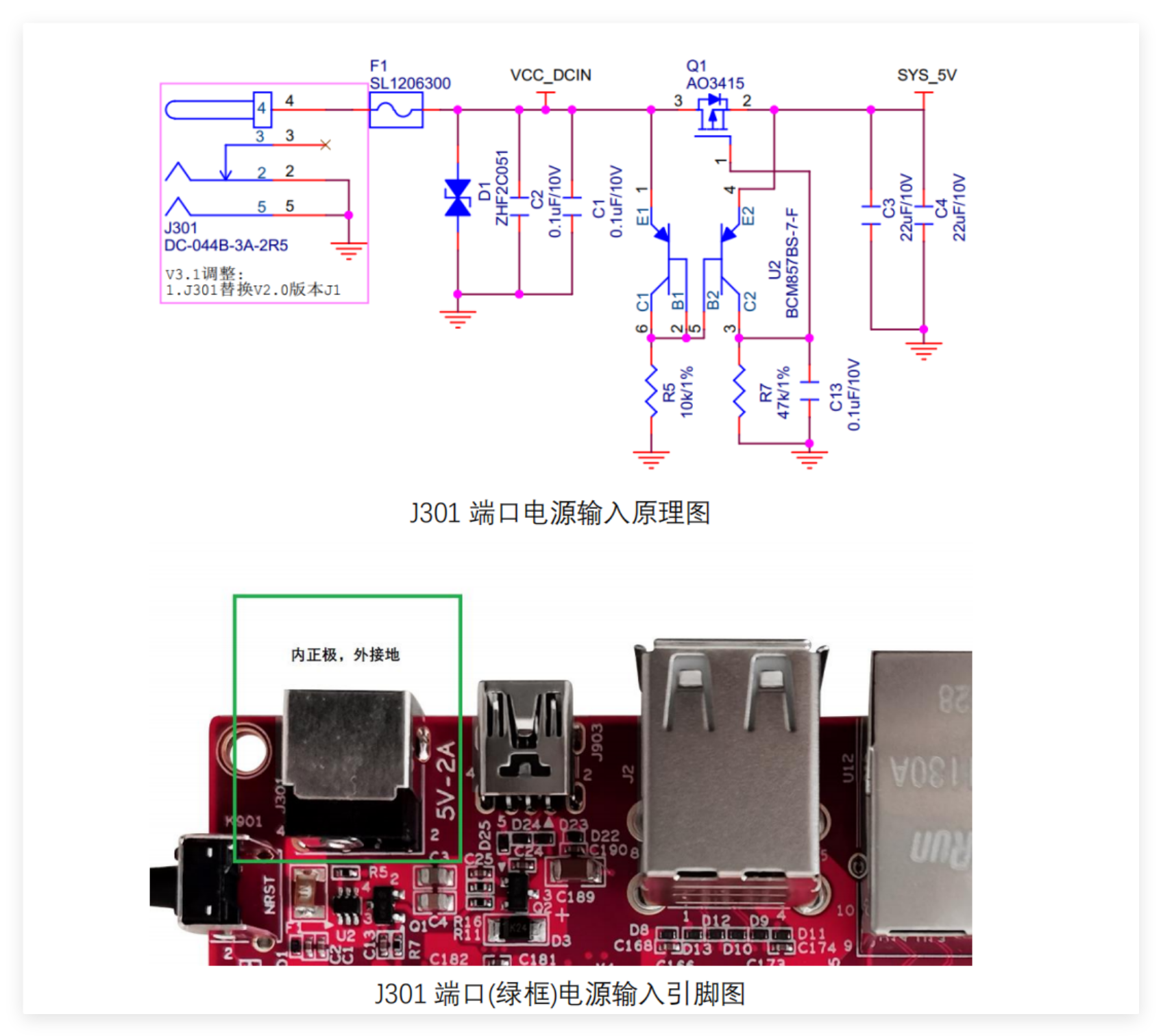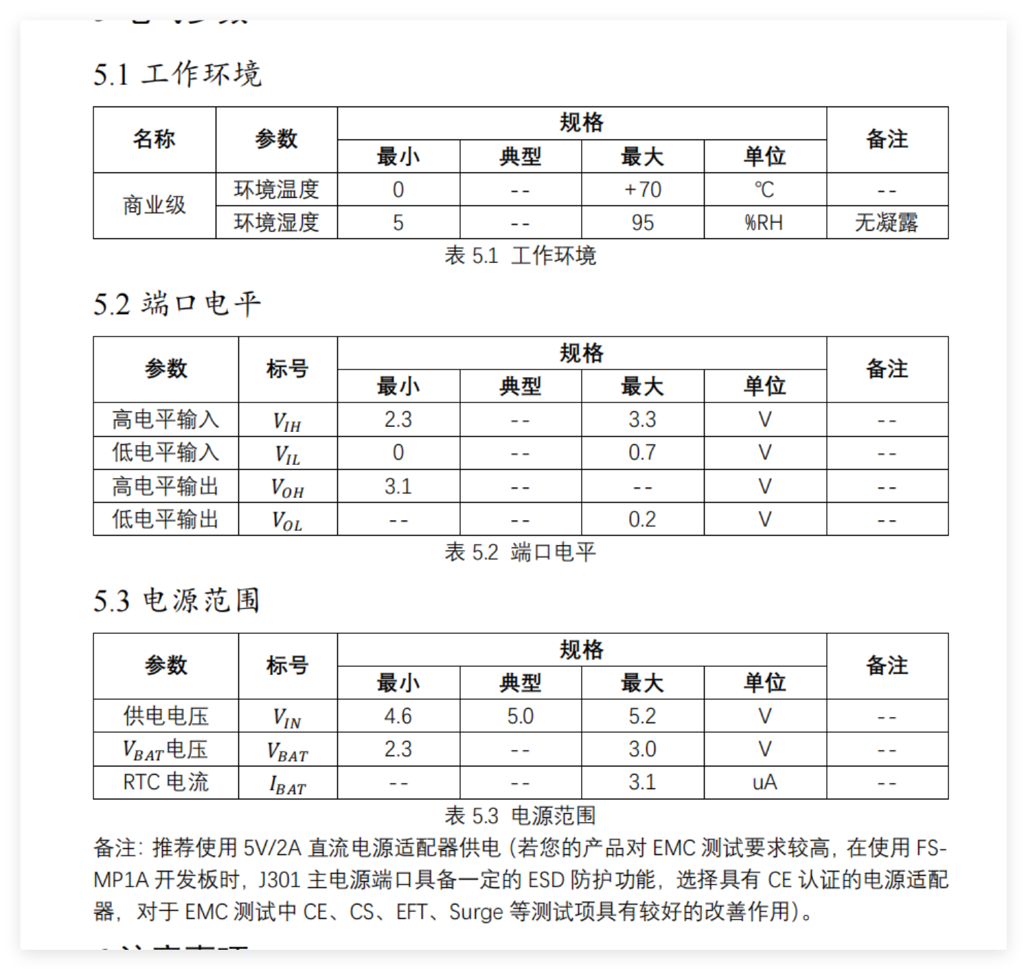 荐使用 5V/2A 直流电源适配器供电(若您的产品对 EMC 测试要求较高,在使用 FS-MP1A 开发板时,J301 主电源端口具备一定的 ESD 防护功能,选择具有 CE 认证的电源适配器,对