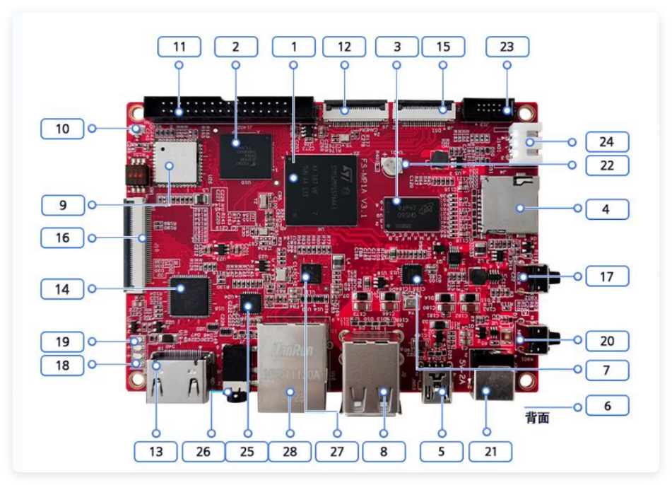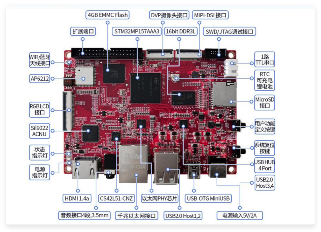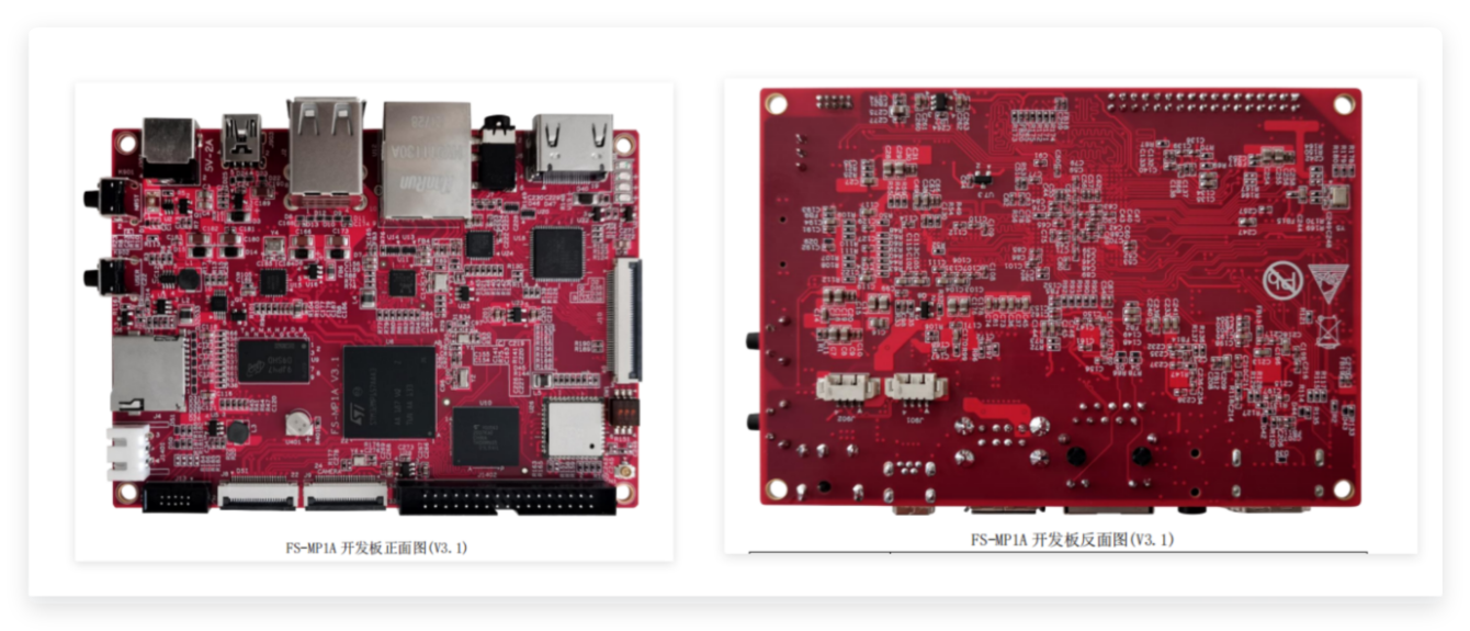 FS-MP1A 开发板默认配置 8GB eMMC flash,512MB DDR3 内存。板载 AP6212 WiFi 蓝牙一体芯 片、千兆自适应以太网卡、可支持 RGB LCD 与 MIPI DSI 显示模组、具有高清 HDMI 接口、1 路 DVP 摄像头接口可以支持 500W 高清摄像头的接入、4 路 USB HOST 接口,其中 2 路在开发板背部以插针 方式引出,可支持 USB 接口的鼠标键盘和 U 盘的接入等,FS-MP1A 开发板同时还预留一组 IO 扩展口, 可以扩展出串口,CAN 总线接口、ADC 接口等。