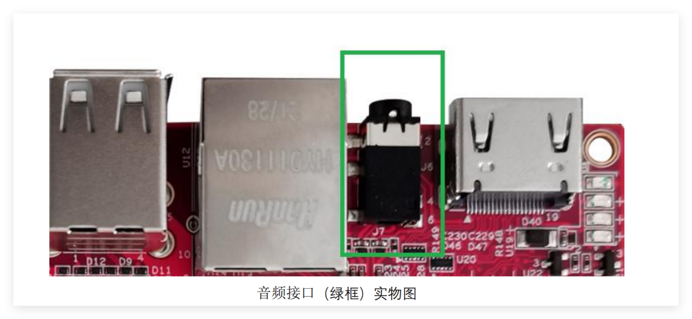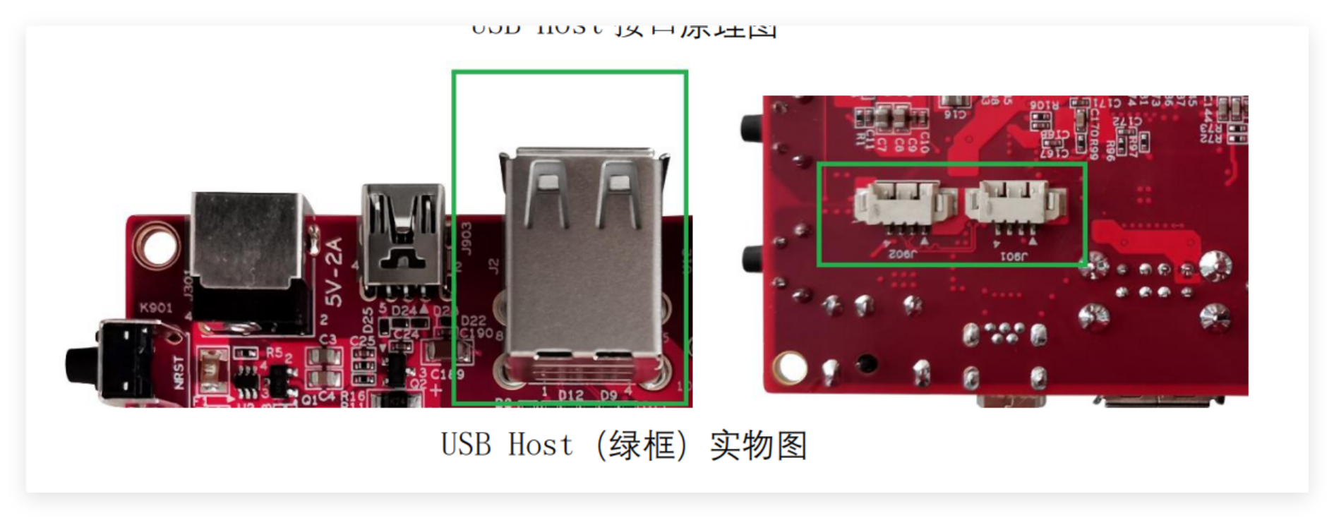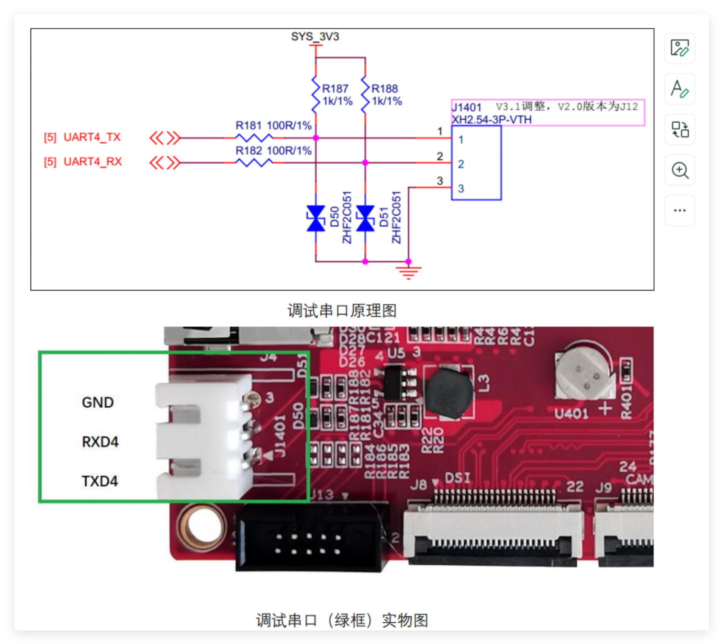 注意:调试串口(绿框)实物图中的数字代表实际接口引脚号顺序,该调试端口具备 一定 ESD 防护功能。