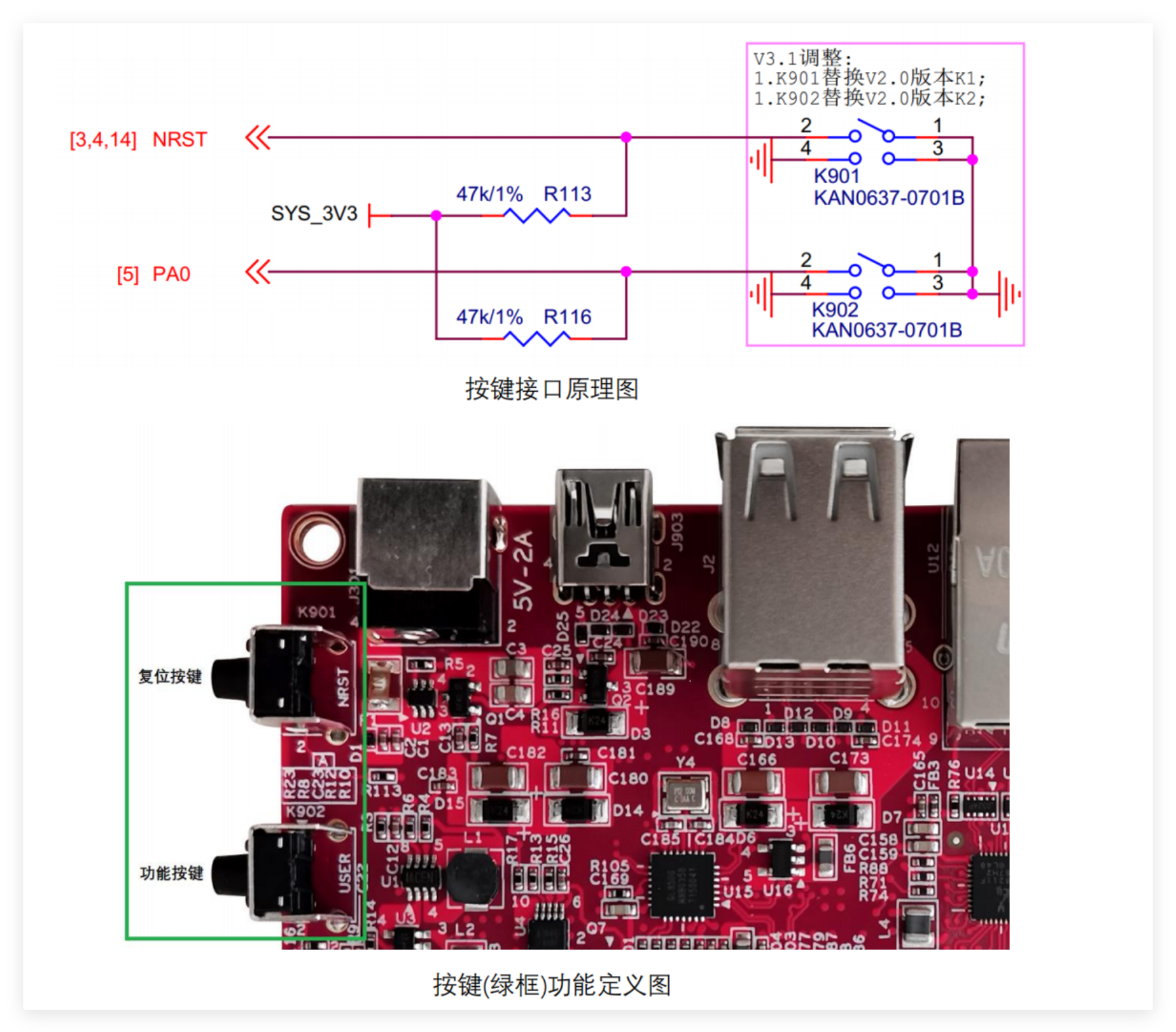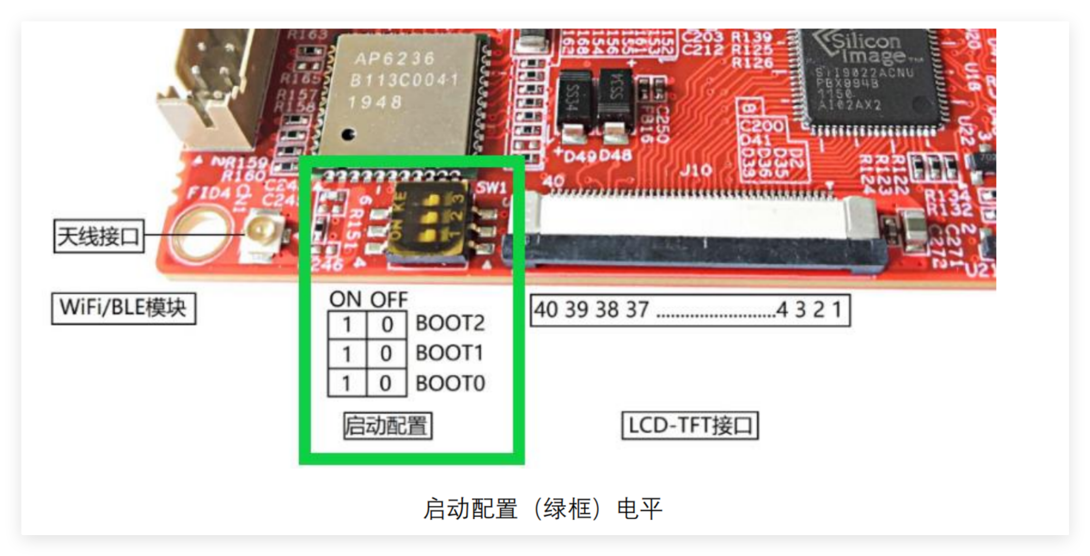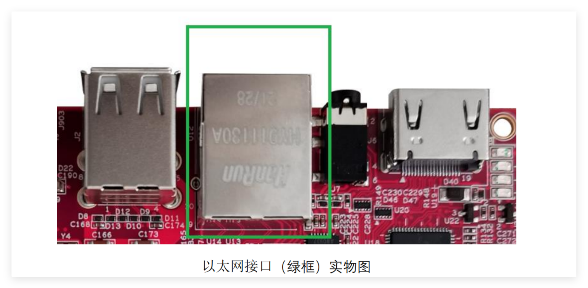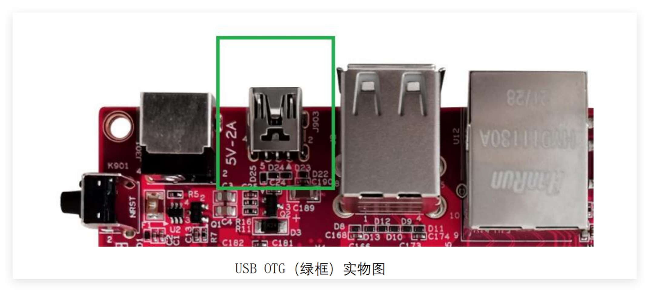 注意:调试串口(绿框)实物图中的数字代表实际接口引脚号顺序,该调试端口具备 一定 ESD 防护功能。