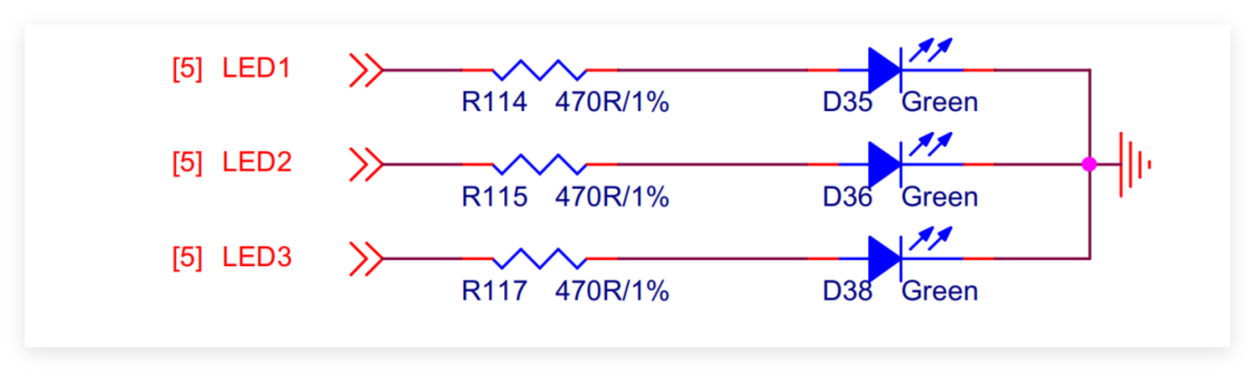 FS-MP1A 开发板提供 3 路状态指示灯以及 1 路电源指示灯。3 路状态指示灯为用户自 定义功能灯,连接到 PZ5/PZ6/PZ7 管脚,默认固件将 D35 指示灯定义为心跳灯,用户也可自 行更改程序,改变其功能。电路设计如下所示: