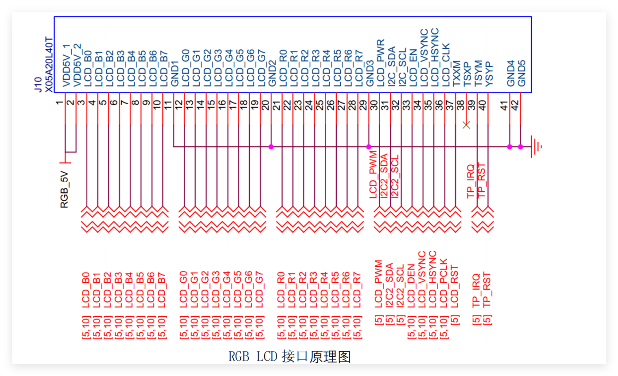 FS-MP1A 开发板配备 1 路 RGB LCD 接口,接口采用 40Pin 间距 0.5mm 的翻盖式 FPC 连 接器,该接口具备以下特性: