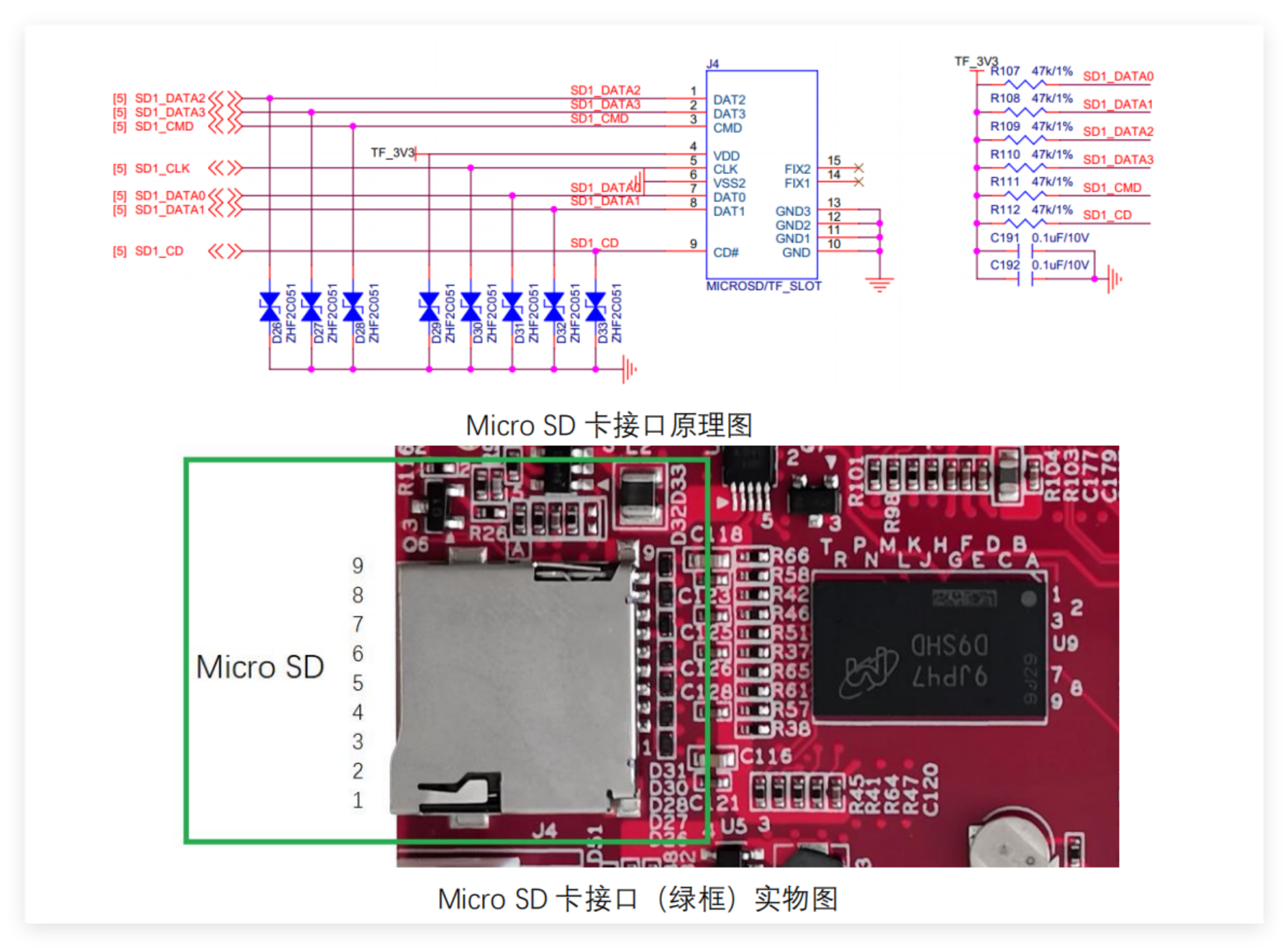 注意:Micro SD 卡接口(绿框)实物图中的数字代表实际接口引脚号顺序。