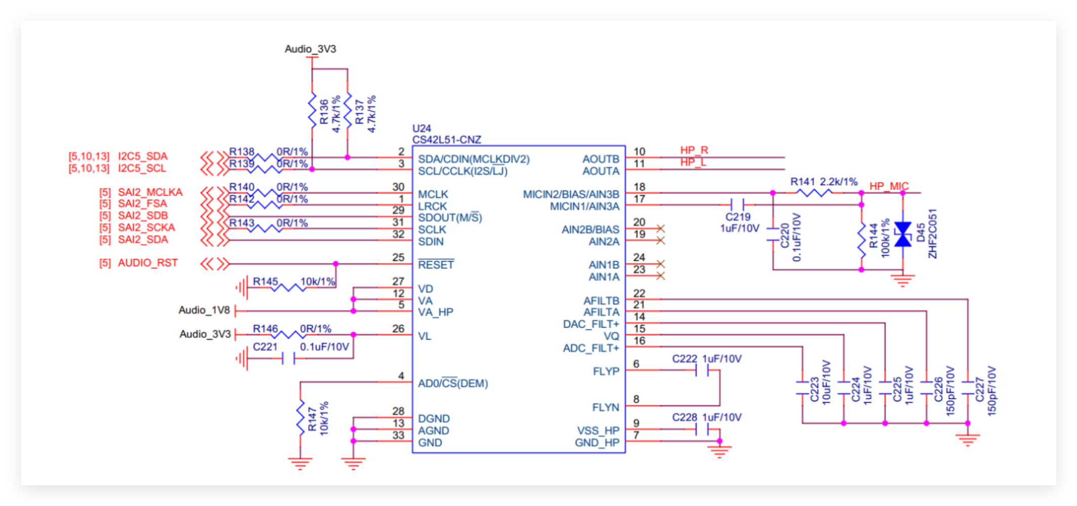 FS-MP1A 开发板配备 1 路国际标准(CTIA)3.5mm 四段音频耳机接口,可用于播放立体 声音乐和录制音频文件。该接口音频编解码芯片采用 CS42L51-CNZ,具有优秀的音频性能, 功耗低,可为 16Ω 立体声耳机提供充足的 46 mW 输出功率,带来优美的聆听体验,该芯片 连接至处理器的 SAI2 控制器。电路设计如下所示