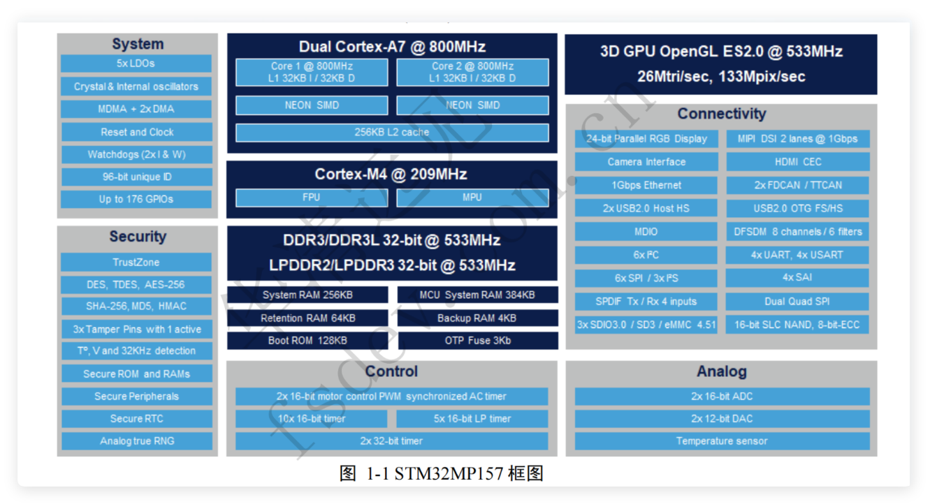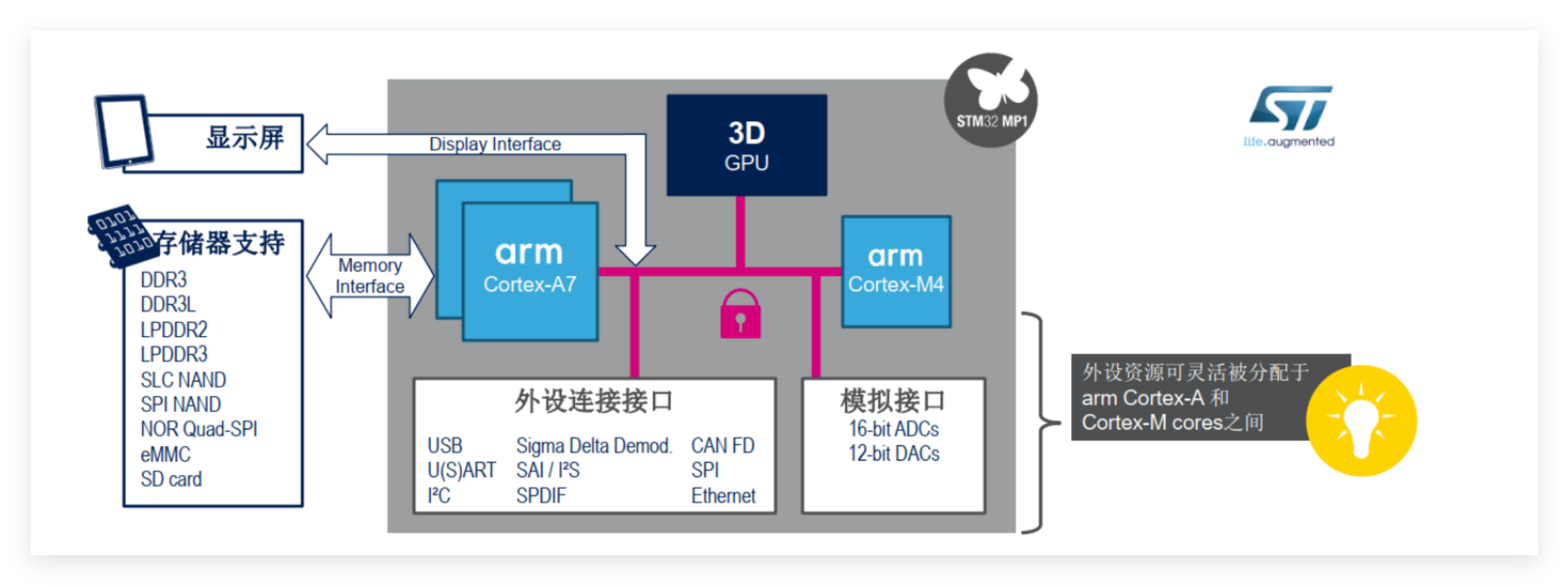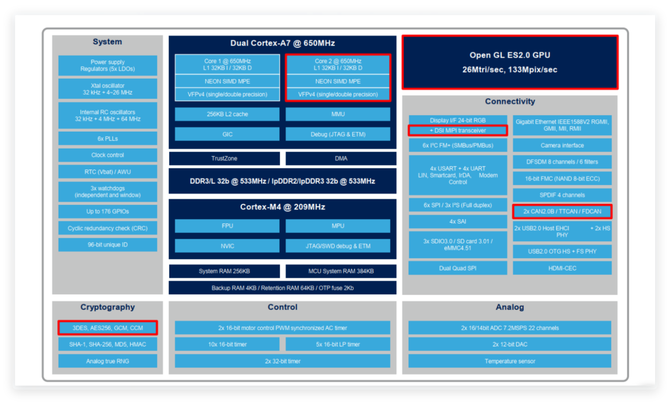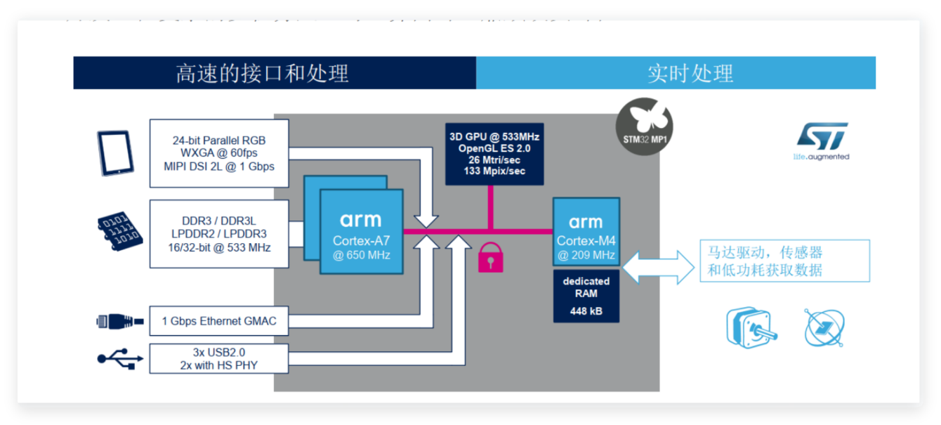 2 . 提供 Arm®双核 ARM Cortex A7/ 650MHz 和 Cortex®-M4/ 209MHz 两种内核的异构架构 开发,在复杂的多任务处理与运算同时,兼顾硬实时性。