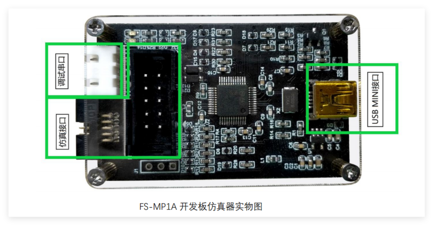 注意:仿真接口(绿框)实物图中的数字代表实际接口引脚号顺序。 FS-MP1A 开发板可选配仿真器模组用于系统的仿真与调试,该仿真器采用 USB MINI 接 口,调试端口包含 1 路调试串口、1 路间距 1.27mm 的 JTAG/SWD 仿真器接口、1 路间距 2.54mm 的 JTAG/SWD 仿真器接口,如下图所示:
