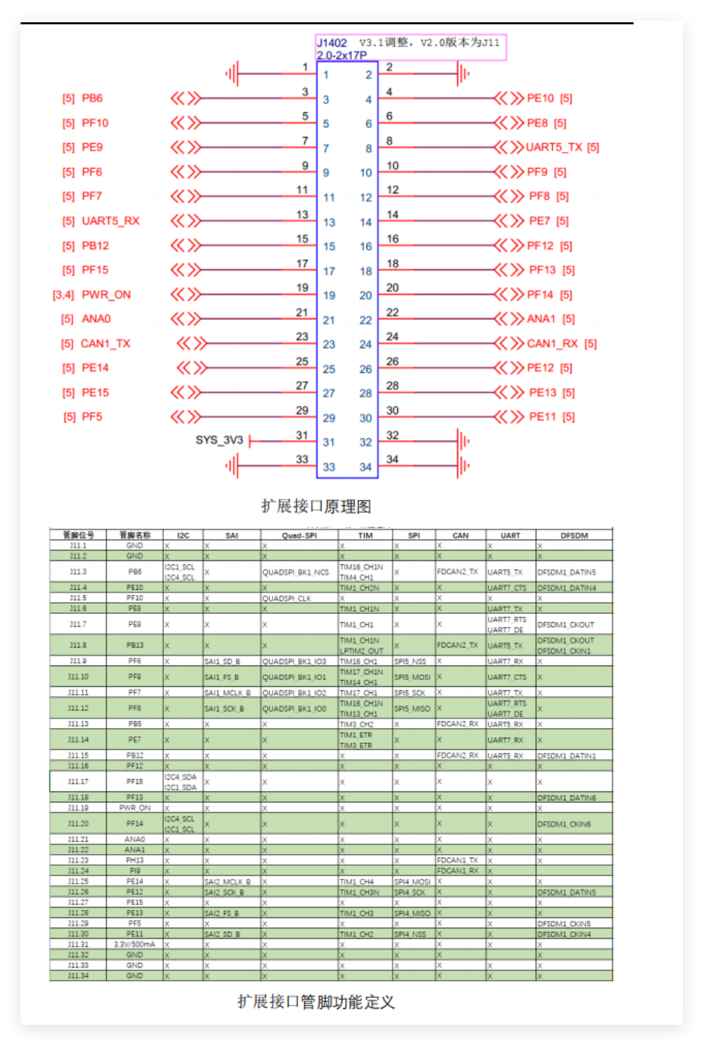 FS-MP1A 开发板配备 1 路扩展接口,连接器采用 2x17 Pin 2.0mm 间距简易牛角连接 器,该扩展接口包含 I2C、SPI、SAI、Quad-SPI、TIM、CAN、UART、DFSDM、A/D 等通用资源, 用于外部设备互联控制,电路设计如下所示: