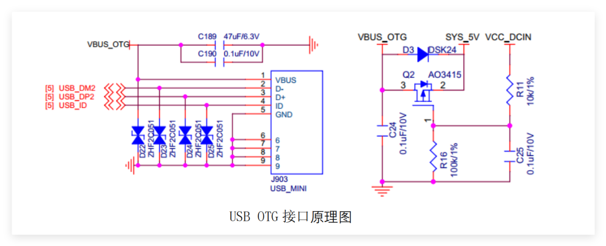 FS-MP1A 开发板将 USB OTG 通过 mini USB 座直接引出,可用于 Device 使用。该端口可 用于系统镜像升级,也可用于主板供电,需要注意当采用 PC 机的 USB 端口供电时,需要考 虑 PC 机 USB 端口电流限制(一般限制为 500mA),该限制会造成大功率外设使用异常或造成 主板异常。电路设计如下所示: