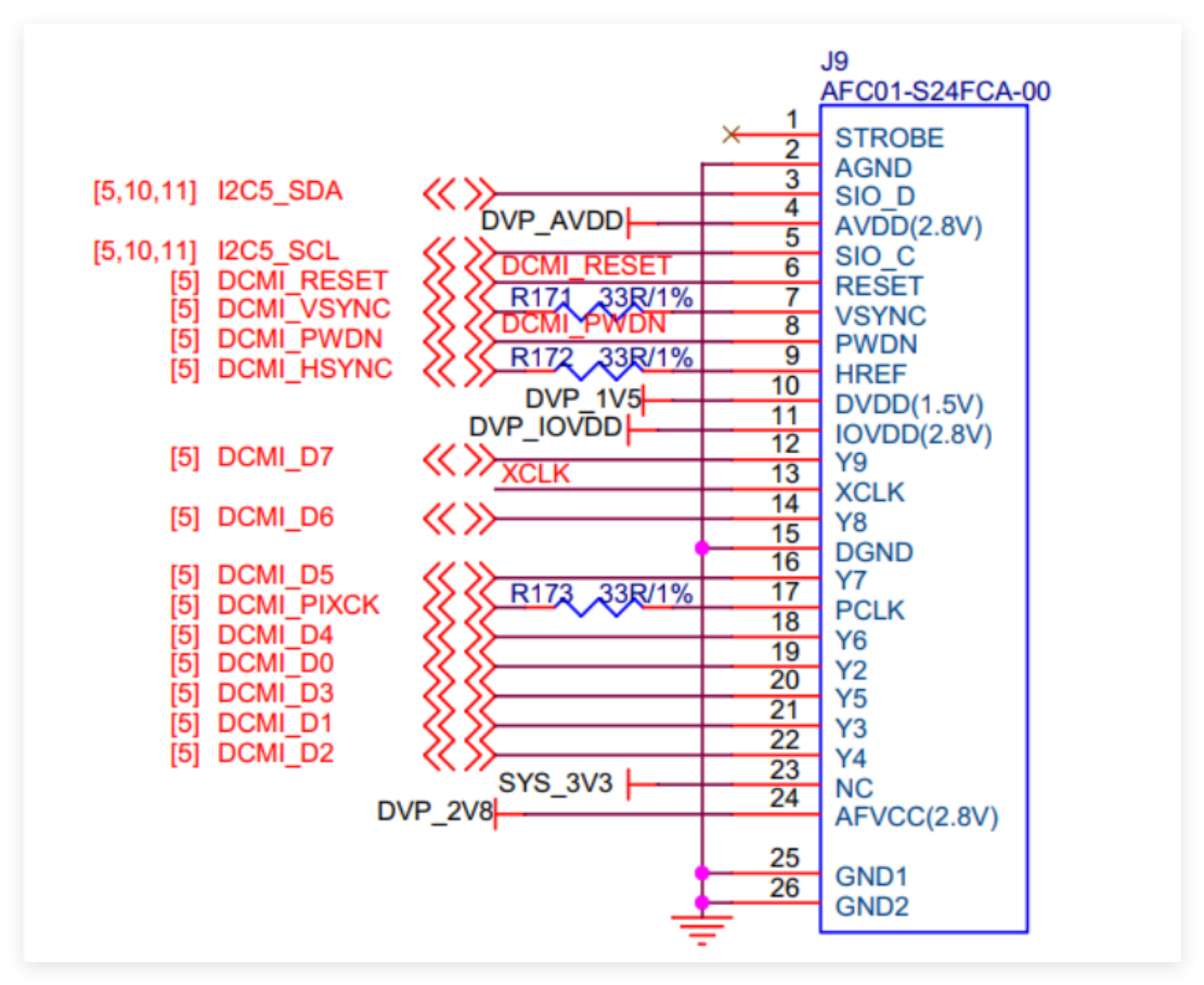 FS-MP1A 开发板配备 1 路 DCMI 接口,接口采用 24Pin 间距 0.5mm 的翻盖式 FPC 连接 器,提供 8bit 并行数据接口,板载 24M 有源时钟,提供 1.5V 与 2.8V 摄像头电源,电路设计