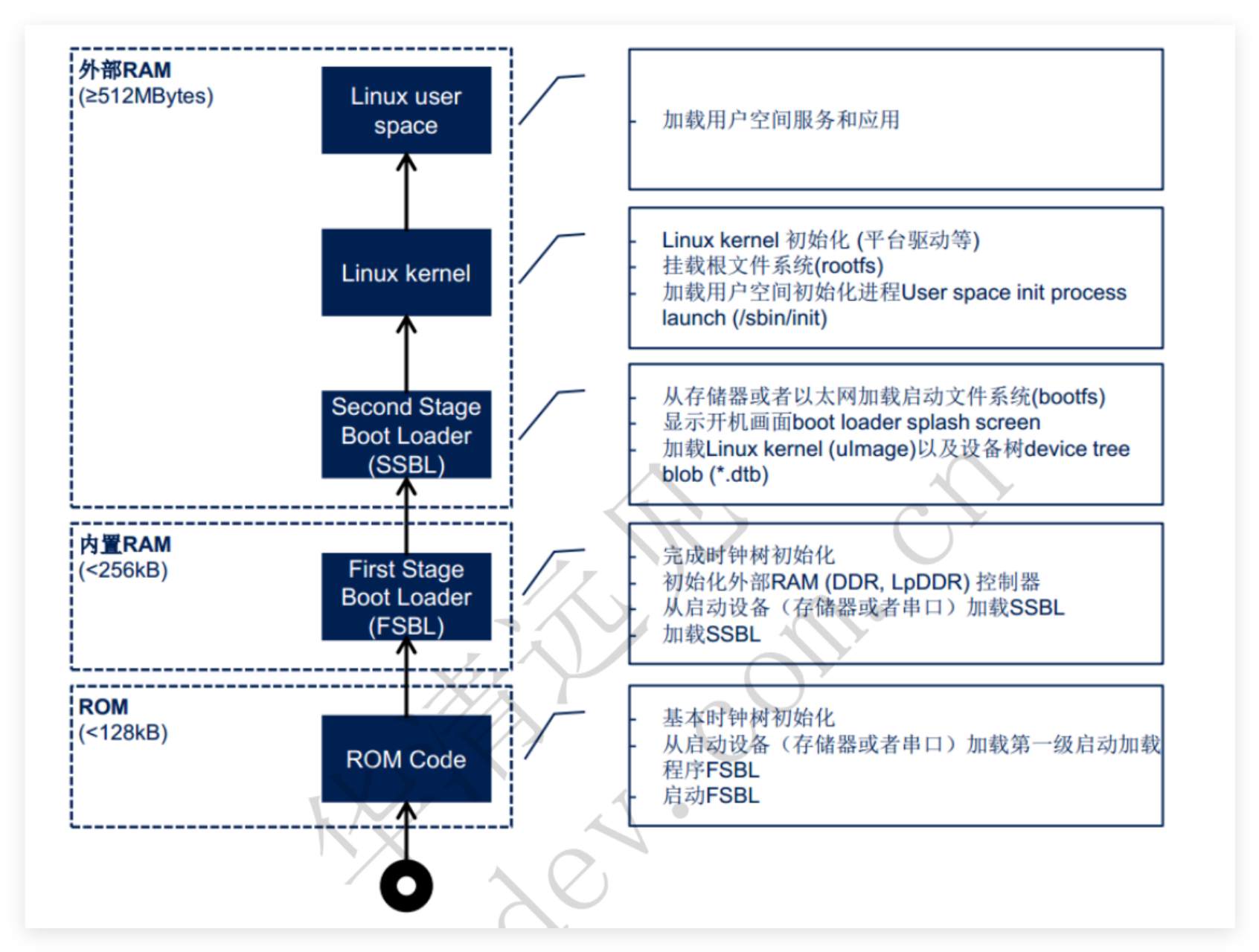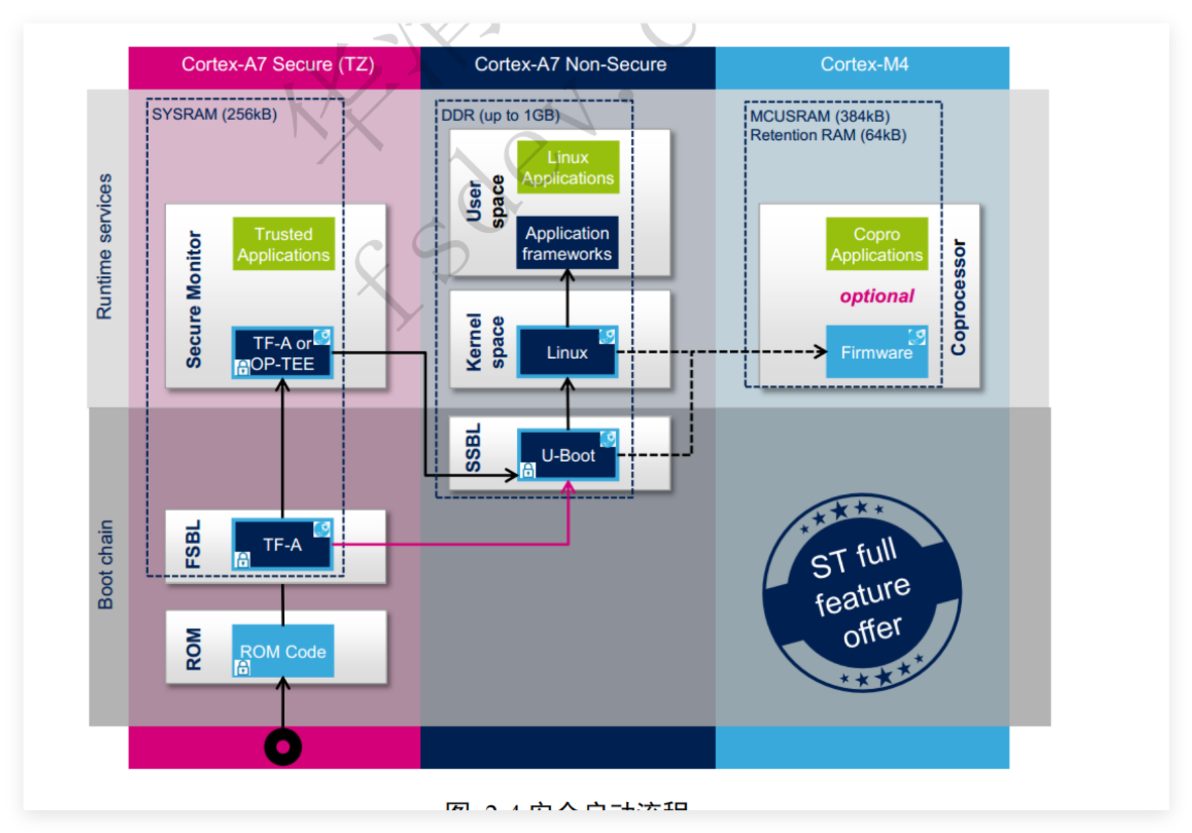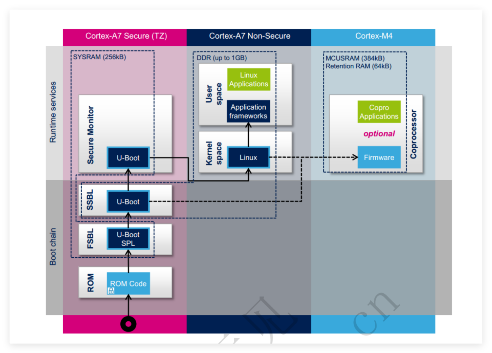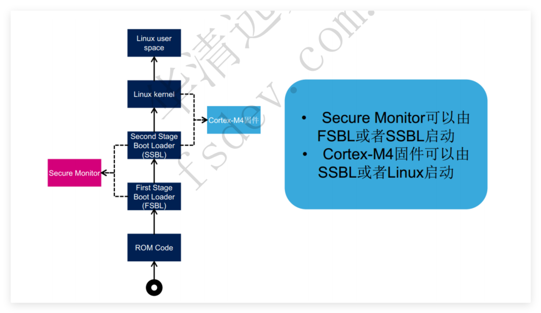 与标准流程基本一致,多提供了一种安全监控的模式,可以由 FSBL 或者 SSBL 启动。由于该开发板 采用异核架构,有 A 核和 M 核,如果要加载 M 核的固件,可以在 SSBL 或者 linux 启动。