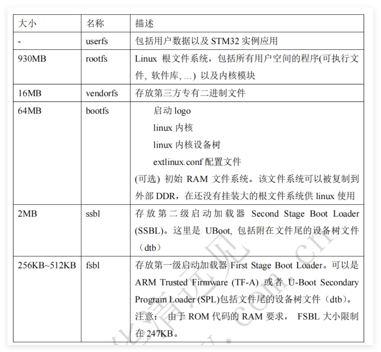 文件系统:不同的分区被用来存放不同类型的文件系统。userfs、rootfs、vendorfs 等都是不同类型的文 件系统,存放着用户数据、Linux 根文件系统以及第三方专有文件等。