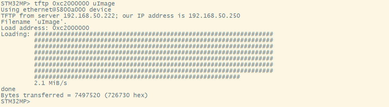 STM32MP> setenv bootcmd tftp 0xc2000000 uImage\; tftp 0xc4000000 stm32mp157a-fsmp1a.dtb\;bootm 0xc2000000 - 0xc4000000 STM32MP> saveenv