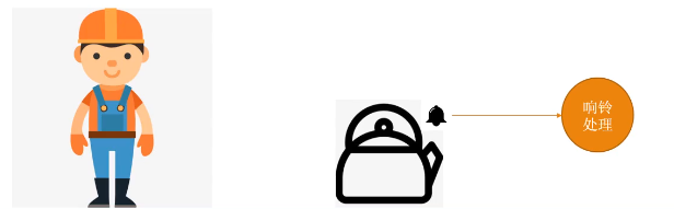 还是这个人,这个壶,这次不一样的是,这个人给壶进行了改装,烧开后壶会自动触发响铃处理。开始点火(发消息),烧水期间这个人一直盯着这个铃当(阻塞),水烧开后触发响铃操作,水是否烧开这条消息不是由这个人处理的,而是由铃铛处理的(异步),这就是异步阻塞。