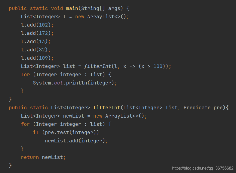 | Predicate | T | boolean | 断言型接口,对类型T进行条件筛选操作,返回boolean,包含方法 boolean test(T t) |