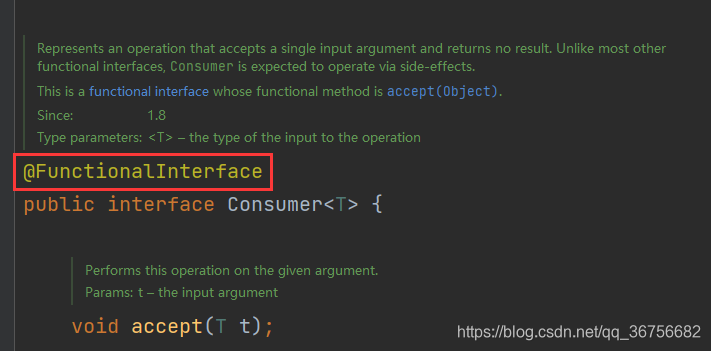 | Consumer | T | void | 对类型T参数操作,无返回结果,包含方法 void accept(T t) |