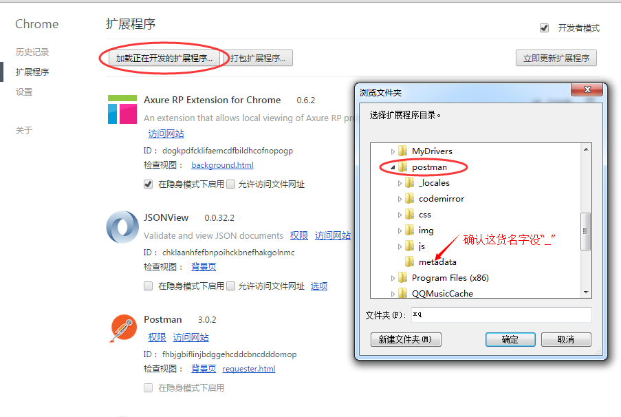 3.点击“加载正在开发的扩展程序...”按钮,然后选中第一步解压出来的文件夹(postman文件夹):
