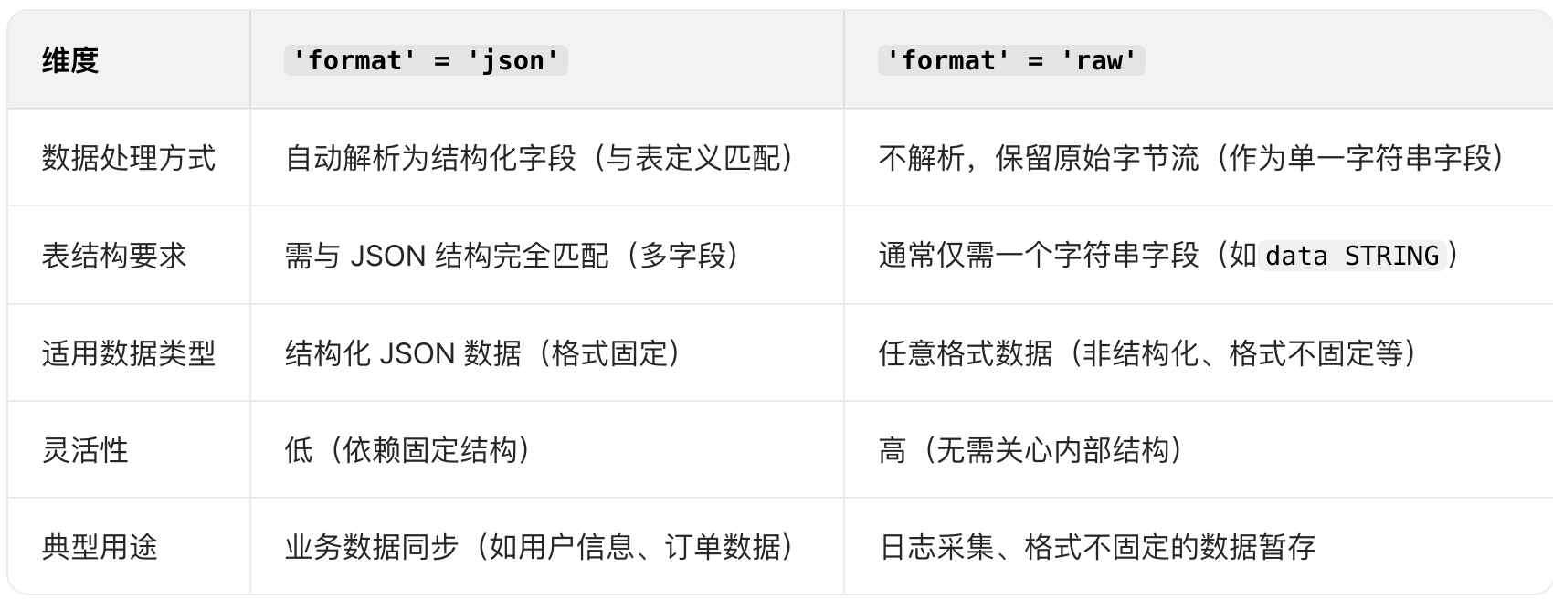 - 读取数据时(Source):无论原始数据是 JSON、字符串、二进制还是其他格式,都会被当作一个单一的字符串字段处理。表定义中通常只需要一个字段(如