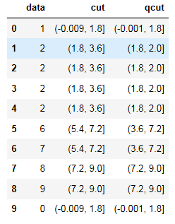df['data'] = [1,2,2,2,2,6,7,8,9,0]#这里注意箱边界值需要唯一,不然qcut时程序会报错