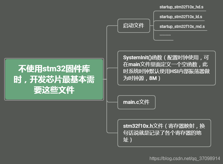 最近重新看了《STM32库开发实战指南》,重新捋一下一个问题,假如没有固件库,那我们最进本需要具备哪些文件才可以使用上咱们这款芯片呢?用xmind简单画了个图: