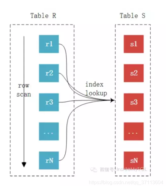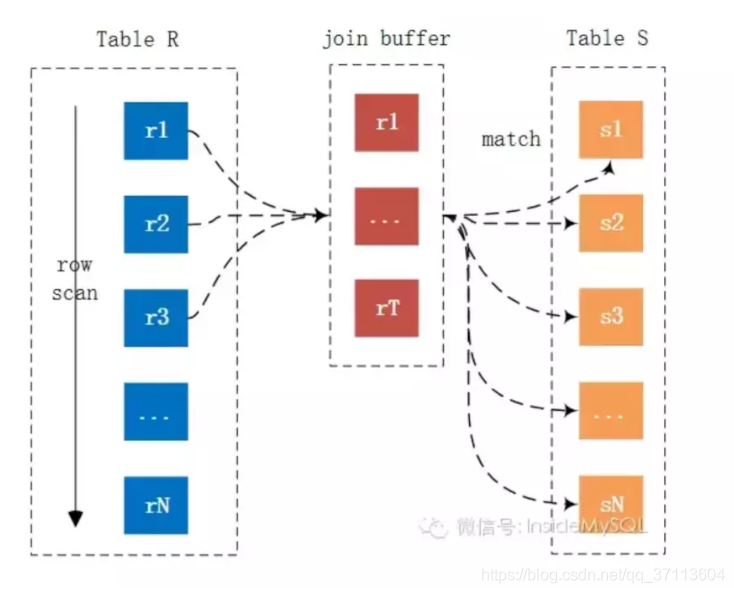BNL 算法:将外层循环的行/结果集存入join buffer, 内层循环的每一行与整个buffer中的记录做比较,从而减少内层循环的次数.