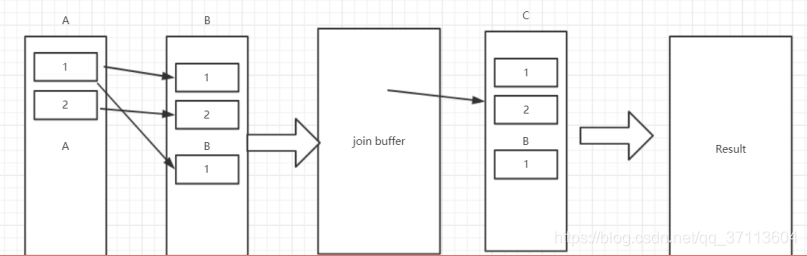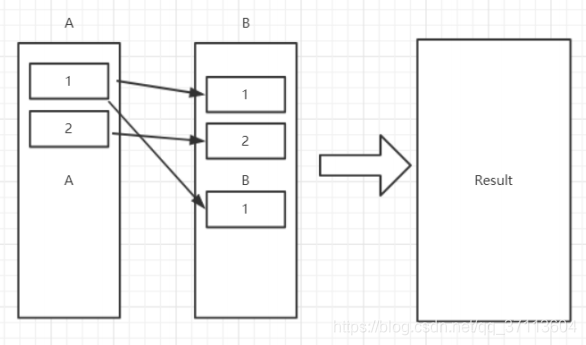 如图,A为驱动表,B为匹配表。 从A中取出数据1,遍历B,将匹配到的数据放到result.. 以此类推,每条A表数据都会轮询B表。