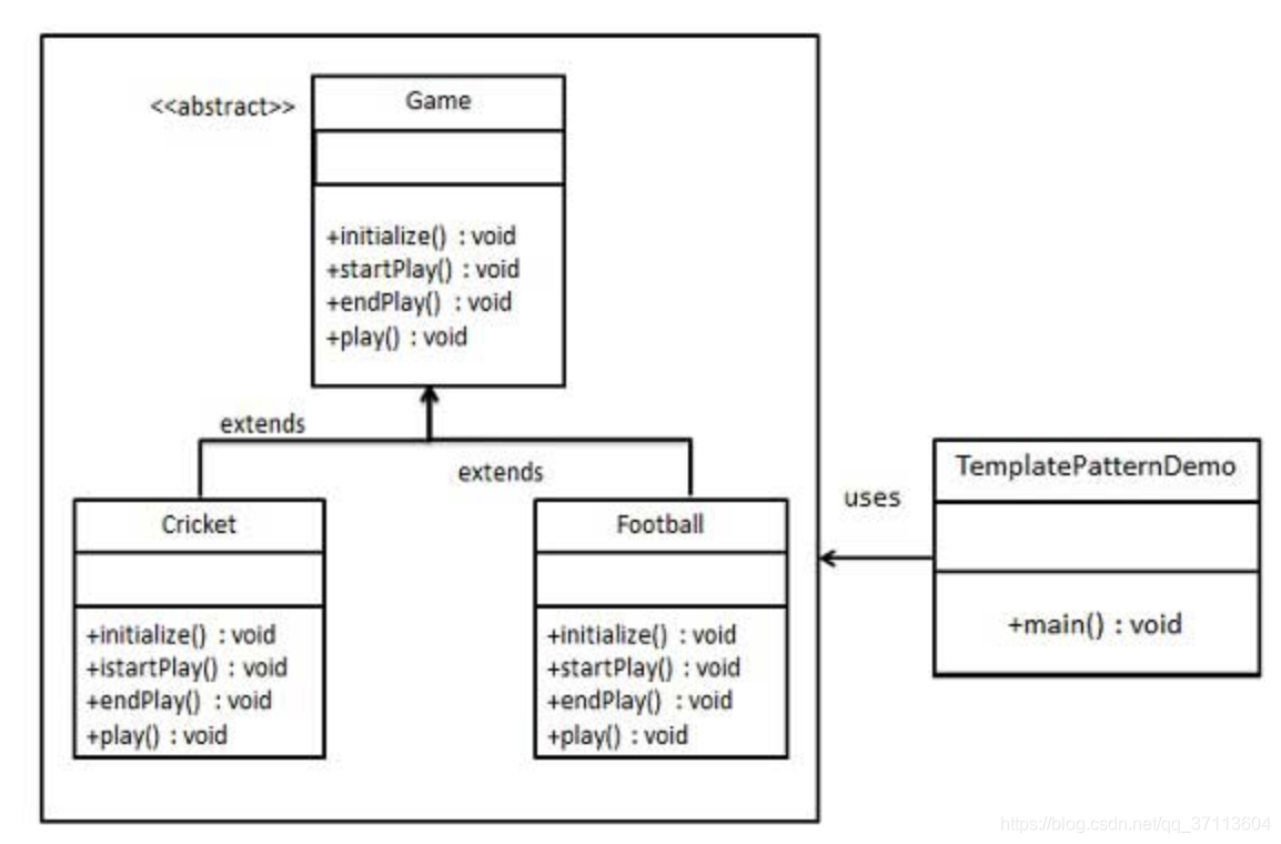 创建一个定义操作的Game抽象类,其中,模板方法设置为final,这样它就不会被重写。Cricket和Football是扩展了Game的实体类,他们重写了抽象类的方法。