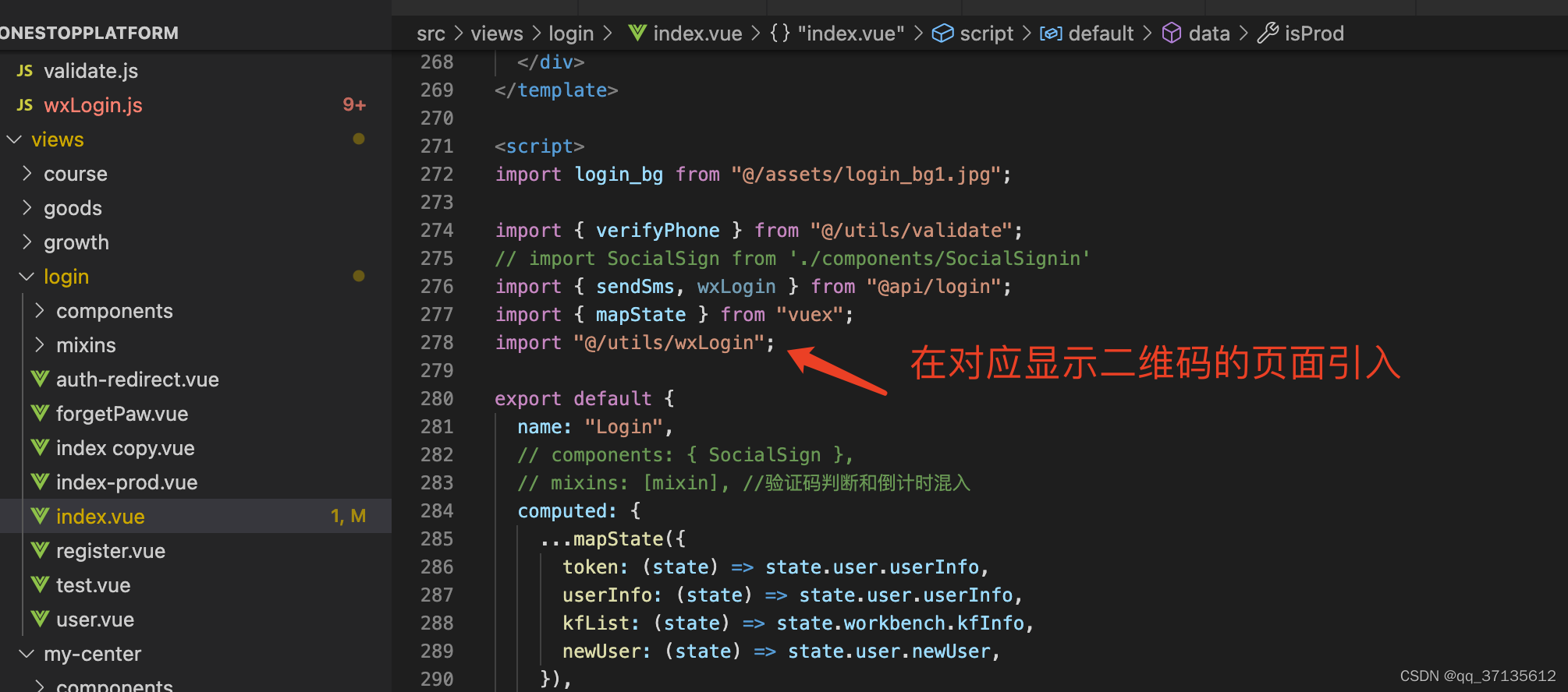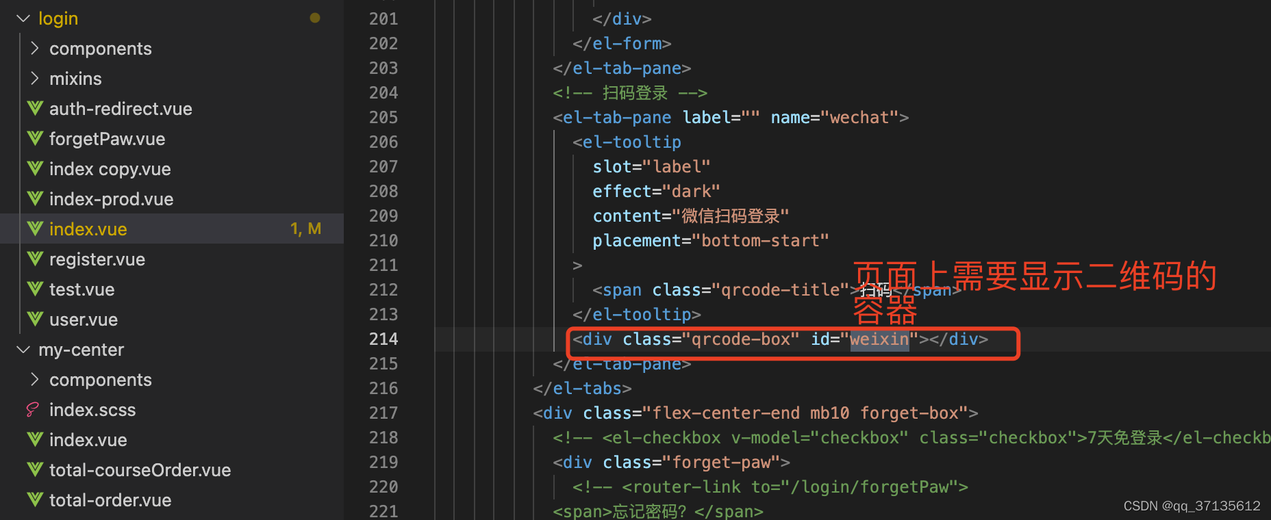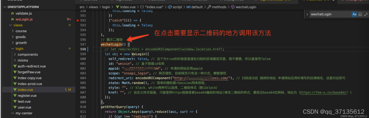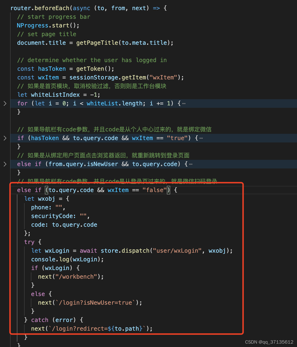 微信扫描二维码授权后,将会自动跳转到redirect_url的地址,地址后面会接上code参数,前端需要做的就是在beforeEach钩子函数里将地址后面携带的code截取并传给后台,后台接收后返回token等用户信息。前端再调用登录接口设置token等即可登录成功。(以下代码参考)